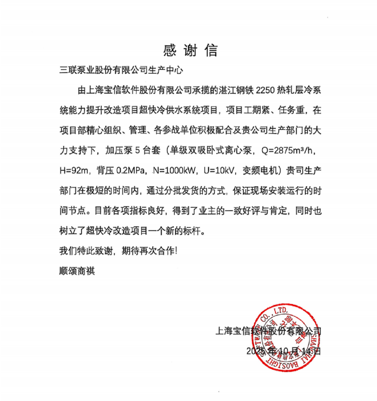 近日,三联泵业股份有限公司收到上海宝信软件股份有限公司发来的感谢信,信中对三联泵业在湛江钢铁2250热轧层冷系统能力提升改造项目超快冷供水系统加压泵的高效生产给予了高度肯定。