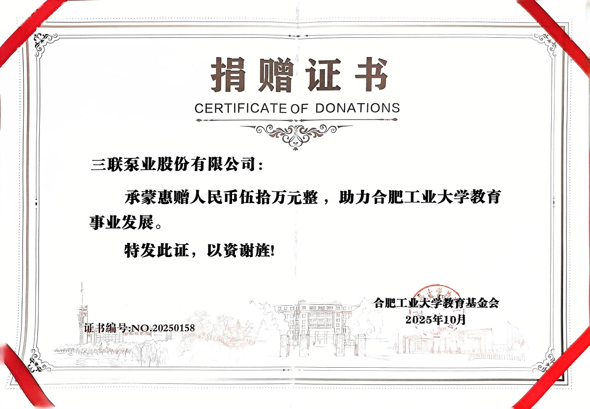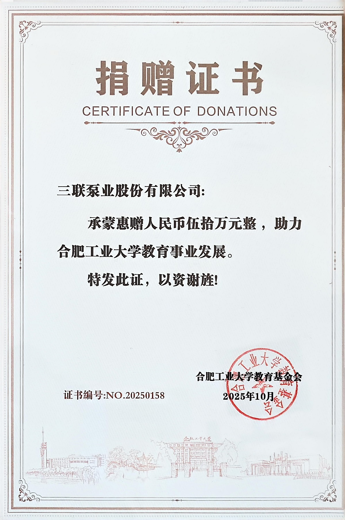 近日,三联泵业股份有限公司向合肥工业大学教育基金会捐赠人民币五十万元,用于支持该校教育事业发展。为表彰这一善举,合肥工业大学教育基金会向三联泵业颁发了捐赠证书。