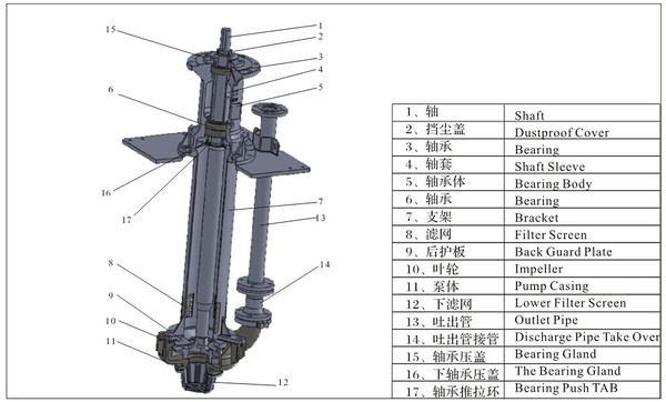 SP 系列泵是立式离心渣浆泵,泵入口垂直向下,出口在泵的另一侧垂直向上。泵主要由下滤网、泵体、叶轮、轴、护板、支架等零件组成,泵上部有轴承支承,泵安装在液下,不要任何轴封,过流部件采用耐磨材料。