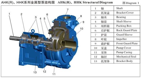 AHK 、HHK 型渣桨泵为单级单吸悬臂卧式离心泵,为替代 PN、PH 等型号的节能换代产品。适用于冶金、矿山、煤炭、电力建材等工业部门输送含有悬浮固体颗粒的液体,如精矿、尾矿、灰渣、煤渣、水泥、泥土、砂砾等强硬度、强磨蚀高浓度渣浆,被输送的固液混合物温度一般不超过 80 ℃,浆体重量浓度可达 60%。