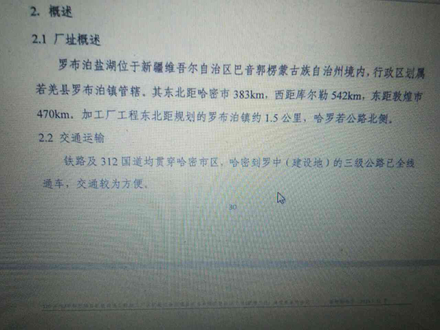 项目简介:罗布泊盐湖位于新疆维吾尔自治区巴音郭楞蒙古族自治州境内,行政区划属若羌县罗布泊镇管辖,其东北距哈密市383km,西距库尔勒542km,东距敦煌市470km,加工厂工程东北距规划的罗布泊镇1.5km,哈罗若公路北侧。